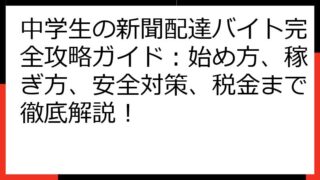 中学生 中学生の新聞配達バイト完全攻略ガイド:始め方、稼ぎ方、安全対策、税金まで徹底解説! 中学生の新聞配達で未来を拓く!完全ガイド:始め方から稼ぎ方、安全対策まで 新聞配達に興味がある中学生の皆さん、こんにちは! このガイドでは、中学生が新聞配達を始めるにあたって知っておくべきことを、徹底的に解説します。 新聞配達は、ただお金を... 2025.08.25 中学生