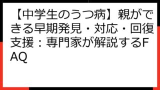 中学生 【中学生のうつ病】親ができる早期発見・対応・回復支援:専門家が解説するFAQ 【中学生の親御さん必見】わが子のうつ病、早期発見・早期対応のための完全ガイド 思春期は、心身ともに大きな変化を迎える大切な時期です。 しかし、その変化の中で、お子さんがうつ病という辛い病に苦しんでいるサインを見逃してしまうことがあります。 ... 2025.08.15 中学生