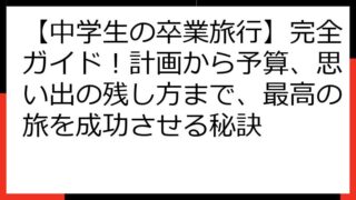 中学生 【中学生の卒業旅行】完全ガイド!計画から予算、思い出の残し方まで、最高の旅を成功させる秘訣 【完全ガイド】中学生の卒業旅行!思い出に残る最高の旅を計画しよう! いよいよ中学校の卒業。 この特別な節目に、友達や家族と、一生忘れられない卒業旅行に出かけませんか? この記事では、中学生の卒業旅行を成功させるための、あらゆる情報をお届けし... 2025.08.15 中学生