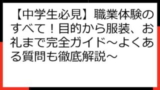 中学生 【中学生必見】職業体験のすべて!目的から服装、お礼まで完全ガイド~よくある質問も徹底解説~ 【中学生必見】職業体験のすべて!目的から服装、お礼まで完全ガイド このブログ記事では、中学生の皆さんが職業体験を最大限に活用できるよう、徹底的に解説します。 将来の夢を見つけるための第一歩となる職業体験。 その目的や、体験先選びのコツから、... 2025.08.15 中学生