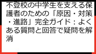 不登校 不登校の中学生を支える保護者のための「原因・対策・進路」完全ガイド:よくある質問と回答で疑問を解消 【完全ガイド】不登校の中学生を支える親御さんのための、原因・対策・進路まで徹底解説 「うちの子、学校に行きたがらない…」 「どうしてこんなことになってしまったのだろう?」 「これから、どうしたら良いのだろう?」 そんな悩みを抱える保護者の皆... 2025.08.14 不登校