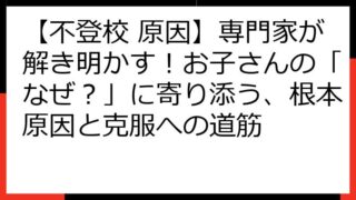 不登校 【不登校 原因】専門家が解き明かす!お子さんの「なぜ?」に寄り添う、根本原因と克服への道筋 【専門家解説】不登校の根本原因と克服への道筋:お子さんの「なぜ?」に寄り添う理解と支援 このブログ記事では、不登校に悩むお子さんを持つ保護者の方々が抱える「なぜうちの子が?」という疑問に、専門的な視点から深く迫ります。 不登校は、単一の原因... 2025.08.14 不登校