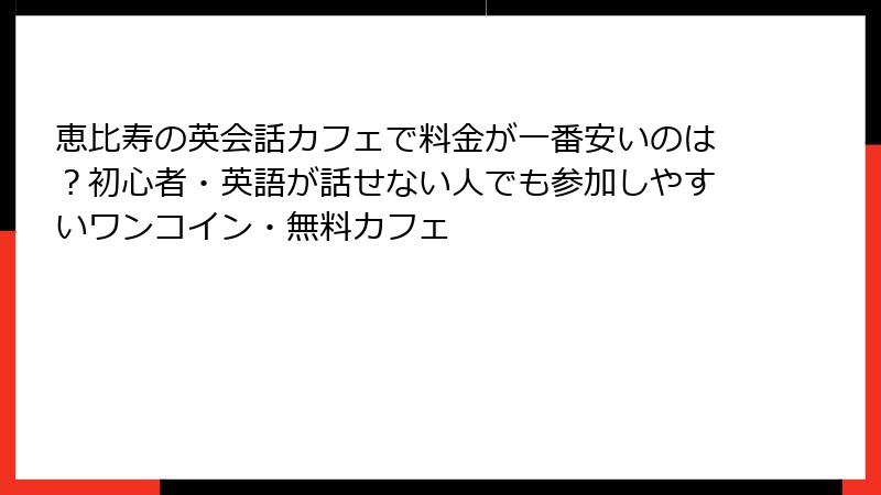 恵比寿のおしゃれな街並みで、気軽に英語を学べる英会話カフェは、初心者から上級者まで幅広い層に人気です。特に、料金がワンコイン(500円程度)で、都度払いで参加できるカフェは、予算を抑えつつ英語を楽しみながら学びたい人に最適。この記事では、恵比寿にある料金が安く、都度払いで気軽に参加できる英会話カフェを詳しく紹介します。ワンコインで楽しめるカフェの特徴や、初心者でも安心のポイント、参加のコツを解説します。英語学習を低コストで始めたい方は必見です!