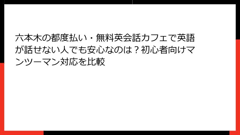 なぜマンツーマンがおすすめか? 六本木の英会話カフェでグループを繰り返した後、マンツーマンに切り替えたら、会話時間が3倍以上に。個人指導なので、発音のクセや文法ミスを即修正してもらえ、自信がつきます。特に六本木の多忙なビジネスマンには、短時間集中がぴったり。私の場合、1回のセッションで「プレゼン英語」が上達し、仕事で即活用できました。