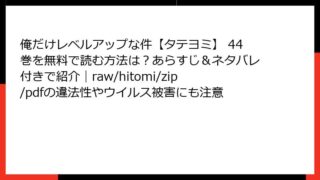 俺だけレベルアップな件【タテヨミ】 俺だけレベルアップな件【タテヨミ】 44巻を無料で読む方法は?あらすじ&ネタバレ付きで紹介|raw/hitomi/zip/pdfの違法性やウイルス被害にも注意 『俺だけレベルアップな件【タテヨミ】』44巻 あらすじ詳解 『俺だけレベルアップな件【タテヨミ】』44巻は、主人公・水篠旬(みずしの しゅん)がさらなる成長を遂げ、転職クエストの核心に迫るエピソードです。この巻では、旬の機転と戦略が光り... 2025.08.25 俺だけレベルアップな件【タテヨミ】青年マンガ