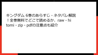 キングダム キングダム 6巻のあらすじ・ネタバレ解説!全巻無料でどこで読めるか、raw・hitomi・zip・pdfの注意点も紹介 キングダム6巻のあらすじを徹底解説! 『キングダム』6巻は、原泰久による大人気漫画『キングダム』の物語がさらに熱を帯びる転換点ともいえる巻です。この巻では、主人公・信が初めて戦場に立つ「初陣」を迎え、秦国と魏国の激しい戦闘が描かれます。... 2025.08.25 キングダム青年マンガ