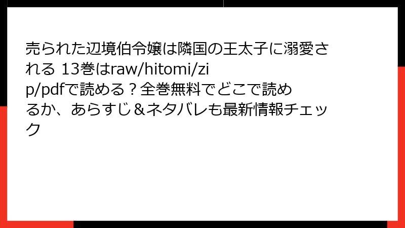 『売られた辺境伯令嬢は隣国の王太子に溺愛される』(小椋あん/COMIC ROOM)の13巻は、アンナ・ハルミッヒとアルビオン王国の王太子ケネスの愛と試練がさらに深まる重要な巻です。この記事では、13巻の詳細なネタバレ情報をブログ形式で解説します。物語の核心に迫る展開やキャラクターの動きを、ネタバレ全開で紹介するので、未読の方はご注意ください。以下、主要なイベントやキャラクターの動向を詳しく掘り下げ、物語の魅力を紐解きます。