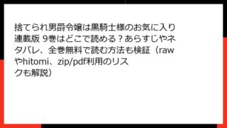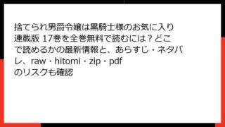 少女マンガ 捨てられ男爵令嬢は黒騎士様のお気に入り 連載版 17巻を全巻無料で読むには?どこで読めるかの最新情報と、あらすじ・ネタバレ、raw・hitomi・zip・pdfのリスクも確認 『捨てられ男爵令嬢は黒騎士様のお気に入り 連載版』17巻 あらすじ 『捨てられ男爵令嬢は黒騎士様のお気に入り 連載版』は、野津川香による漫画で、水野沙彰の原作を基にした人気の溺愛ラブファンタジーです。第17巻では、魔力を持たない令嬢ソフ... 2025.09.07 少女マンガ捨てられ男爵令嬢は黒騎士様のお気に入り 連載版
