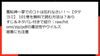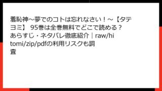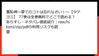 羞恥神~夢でのコトは忘れなさい!~【タテヨミ】 羞恥神~夢でのコトは忘れなさい!~【タテヨミ】 95巻は全巻無料でどこで読める?あらすじ・ネタバレ徹底紹介|raw/hitomi/zip/pdfの利用リスクも調査 羞恥神~夢でのコトは忘れなさい!~【タテヨミ】95巻のあらすじを徹底解説! 「羞恥神~夢でのコトは忘れなさい!~」は、恋愛成就を願う男子高校生・伏見晴樹と校内一の美少女・雪白貴音が夢の中で「恥ずかしいミッション」に挑む、ちょいエロラブコ... 2025.09.05 羞恥神~夢でのコトは忘れなさい!~【タテヨミ】青年マンガ