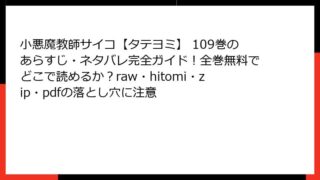 小悪魔教師サイコ【タテヨミ】 小悪魔教師サイコ【タテヨミ】 109巻のあらすじ・ネタバレ完全ガイド!全巻無料でどこで読めるか?raw・hitomi・zip・pdfの落とし穴に注意 『小悪魔教師サイコ【タテヨミ】』109巻 あらすじ詳細 『小悪魔教師サイコ【タテヨミ】』は、三石メガネによる原作小説を基にした、サイコパスな美人教師・葛西心春が織りなすスリリングな学園サスペンス漫画です。109巻では、心春の過激な行動と... 2025.09.07 小悪魔教師サイコ【タテヨミ】青年マンガ