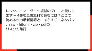 レンタル・マーダー~復讐のプロ、お貸しします~ レンタル・マーダー~復讐のプロ、お貸しします~ 4巻を全巻無料で読むには?どこで読めるかの最新情報と、あらすじ・ネタバレ、raw・hitomi・zip・pdfのリスクも確認 レンタル・マーダー~復讐のプロ、お貸しします~ 4巻の詳細あらすじレビュー こんにちは、漫画好きのブロガーです! 今日は、人気サスペンス漫画『レンタル・マーダー~復讐のプロ、お貸しします~』の4巻について、詳しくあらすじをネタバレ込みで... 2025.09.10 レンタル・マーダー~復讐のプロ、お貸しします~青年マンガ