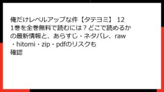 俺だけレベルアップな件【タテヨミ】 俺だけレベルアップな件【タテヨミ】 121巻を全巻無料で読むには?どこで読めるかの最新情報と、あらすじ・ネタバレ、raw・hitomi・zip・pdfのリスクも確認 俺だけレベルアップな件【タテヨミ】 121巻:最強ハンターの影の戦いと運命の転機 こんにちは、漫画好きの皆さん! 今日は、韓国発の大人気ウェブトゥーン『俺だけレベルアップな件』のタテヨミ版、121巻について詳しく語っていきたいと思います... 2025.09.10 俺だけレベルアップな件【タテヨミ】青年マンガ