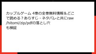 カップルゲーム カップルゲーム 4巻の全巻無料情報&どこで読める?あらすじ・ネタバレと共にraw/hitomi/zip/pdfの落とし穴も検証 カップルゲーム 4巻の詳細あらすじ:デスゲームの深淵へ こんにちは、漫画好きの皆さん! 今日は、人気デスゲーム漫画『カップルゲーム』の第4巻について、詳しくあらすじを語っていきたいと思います。この作品は、愛し合うカップルたちが廃墟の遊園... 2025.09.10 カップルゲーム青年マンガ