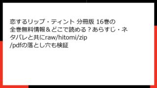 少女マンガ 恋するリップ・ティント 分冊版 16巻の全巻無料情報&どこで読める?あらすじ・ネタバレと共にraw/hitomi/zip/pdfの落とし穴も検証 『恋するリップ・ティント 分冊版 16巻』の魅力に迫る! 詳細あらすじレビュー みなさん、こんにちは! 少女漫画大好きブロガーのかなこです。今日は、楠なな先生の人気作『恋するリップ・ティント』の分冊版16巻について、詳しくお話ししたいと... 2025.09.10 少女マンガ恋するリップ・ティント 分冊版