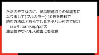 ただのモブなのに、侯爵家跡取りの保護者になりまして(フルカラー) ただのモブなのに、侯爵家跡取りの保護者になりまして(フルカラー) 10巻を無料で読む方法は?あらすじ&ネタバレ付きで紹介|raw/hitomi/zip/pdfの違法性やウイルス被害にも注意 ただのモブなのに、侯爵家跡取りの保護者になりまして(フルカラー) 10巻の魅力的なあらすじを徹底解説! こんにちは、漫画好きのブロガーです! 今日は、異世界転生と甘々溺愛要素が満載の人気コミック『ただのモブなのに、侯爵家跡取りの保護者に... 2025.09.08 ただのモブなのに、侯爵家跡取りの保護者になりまして(フルカラー)少女マンガ