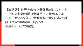 【単話版】世界を救った最強勇者にストーカーされる村娘の話 【単話版】世界を救った最強勇者にストーカーされる村娘の話 3巻はどこで読める?あらすじやネタバレ、全巻無料で読む方法も検証(rawやhitomi、zip/pdf利用のリスクも解説) 【単話版】世界を救った最強勇者にストーカーされる村娘の話 3巻の魅力に迫る! ヤンデレ勇者の執着が加速する修行編の詳細あらすじ みなさん、こんにちは! ファンタジー恋愛漫画が大好きなブログ主です。今日は、潮里潤先生の傑作『【単話版】世界... 2025.09.09 【単話版】世界を救った最強勇者にストーカーされる村娘の話少女マンガ