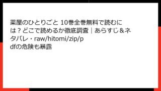 少女マンガ 薬屋のひとりごと 10巻全巻無料で読むには?どこで読めるか徹底調査|あらすじ&ネタバレ・raw/hitomi/zip/pdfの危険も暴露 『薬屋のひとりごと』10巻 あらすじ詳細 『薬屋のひとりごと』は、日向夏によるライトノベルを原作とした人気漫画で、薬師の少女・猫猫(マオマオ)が後宮を舞台に薬学の知識を活かして謎を解くミステリーとラブコメが魅力の作品です。10巻では、舞... 2025.09.06 少女マンガ薬屋のひとりごと