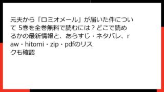 元夫から「ロミオメール」が届いた件について 元夫から「ロミオメール」が届いた件について 5巻を全巻無料で読むには?どこで読めるかの最新情報と、あらすじ・ネタバレ、raw・hitomi・zip・pdfのリスクも確認 元夫から「ロミオメール」が届いた件について 5巻 あらすじ詳細 漫画「元夫から『ロミオメール』が届いた件について」5巻は、主人公・藤松紗雪の波乱に満ちた物語がさらに加速する展開を見せます。元夫・雄大からの執拗なロミオメールと、元夫の不倫... 2025.09.09 元夫から「ロミオメール」が届いた件について女性マンガ