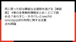 女性マンガ 死に戻った妃は華麗なる復讐を遂げる【単話版】 4巻の全巻無料情報まとめ!どこで読める?あらすじ・ネタバレとraw/hitomi/zip/pdfの利用に関する注意点も網羅 『死に戻った妃は華麗なる復讐を遂げる【単話版】』4巻のあらすじを徹底解説 『死に戻った妃は華麗なる復讐を遂げる【単話版】』4巻は、壮絶な復讐劇の新たな局面を描いた作品です。主人公キャサリンが、ハイラント王国の陰謀によって無実の罪で処刑さ... 2025.09.09 女性マンガ死に戻った妃は華麗なる復讐を遂げる【単話版】