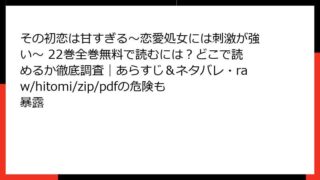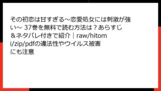 その初恋は甘すぎる~恋愛処女には刺激が強い~ その初恋は甘すぎる~恋愛処女には刺激が強い~ 37巻を無料で読む方法は?あらすじ&ネタバレ付きで紹介|raw/hitomi/zip/pdfの違法性やウイルス被害にも注意 「その初恋は甘すぎる~恋愛処女には刺激が強い~」37巻のあらすじ 「その初恋は甘すぎる~恋愛処女には刺激が強い~」は、真面目な公務員の千鶴と、幼馴染でカリスマホストの司が織りなす、甘く刺激的なラブストーリーです。37巻では、二人の関係が... 2025.09.08 その初恋は甘すぎる~恋愛処女には刺激が強い~女性マンガ