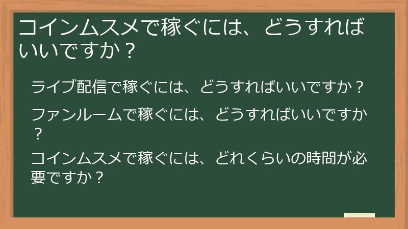 コインムスメで稼ぐために必要な時間は、配信頻度、配信内容、ファンルームの活用など、さまざまな要因によって異なります。