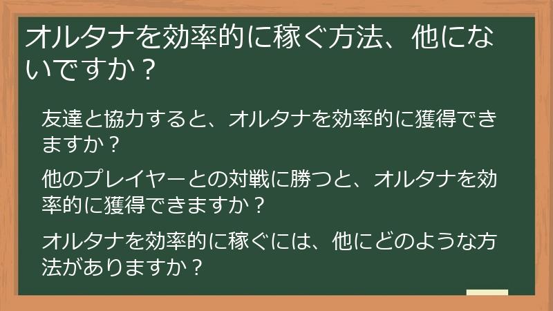 オルタナを効率的に稼ぐには、これらの方法を組み合わせて、積極的にプレイすることが重要です。