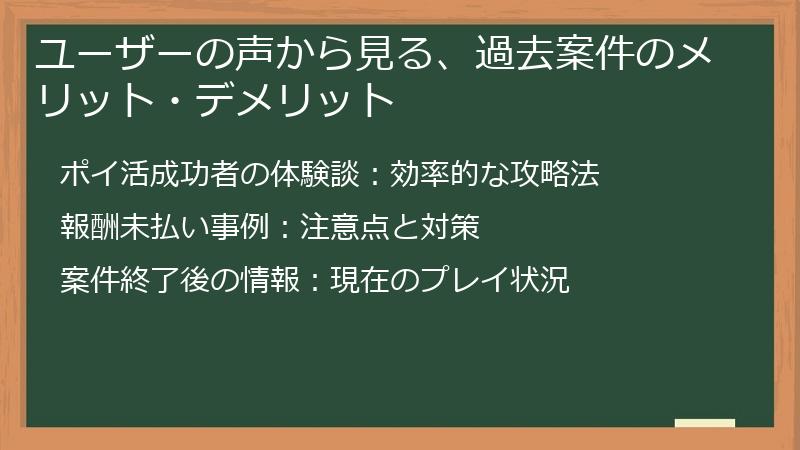 ユーザーの体験談を知ることで、今後案件に挑戦する際の注意点や、効率的な攻略法を学ぶことができます。