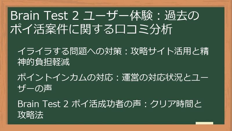 レベル上げの効率化、広告対策、ポイントサイト選びのポイントなど、Brain Test 2のポイ活で成功するために必要な知識を全て網羅しています。