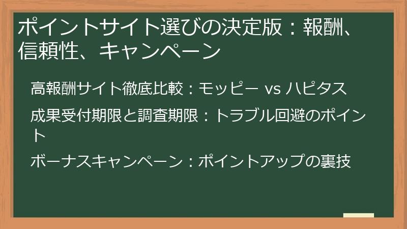 これらの要素を総合的に比較検討し、自分に最適なポイントサイトを選びましょう。