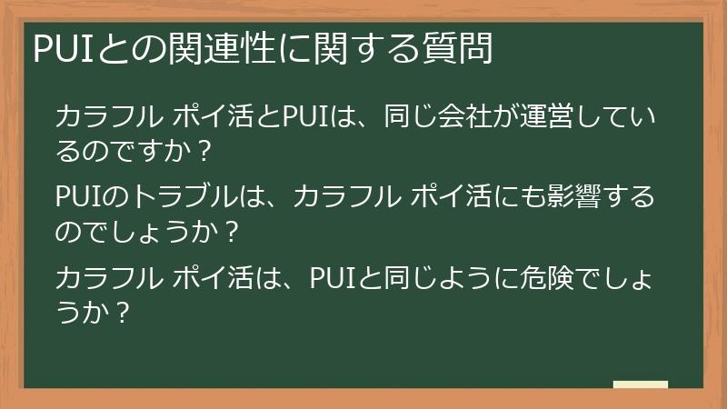 カラフル ポイ活は、PUIと同じ運営会社が開発したアプリであるため、ユーザーは過去のトラブルを踏まえ、運営会社に対する警戒感を抱く可能性があります。