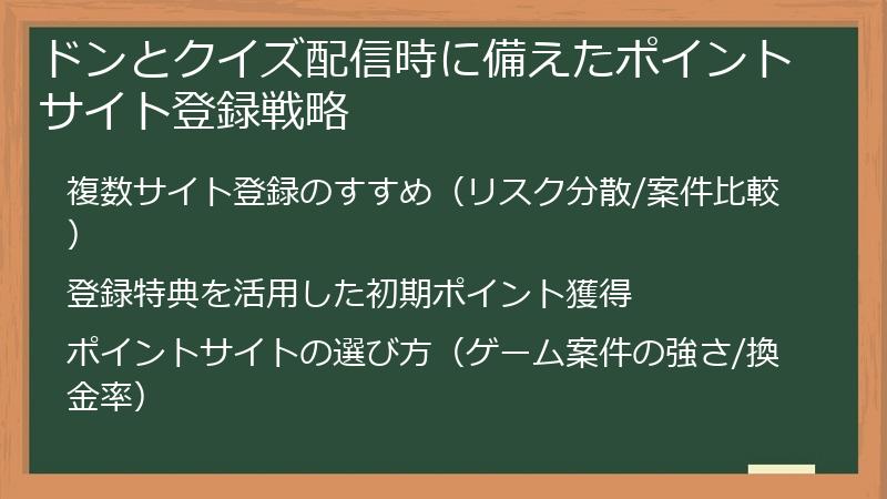 ここでは、「ドンとクイズ」配信時に備えたポイントサイト登録戦略をご紹介します。