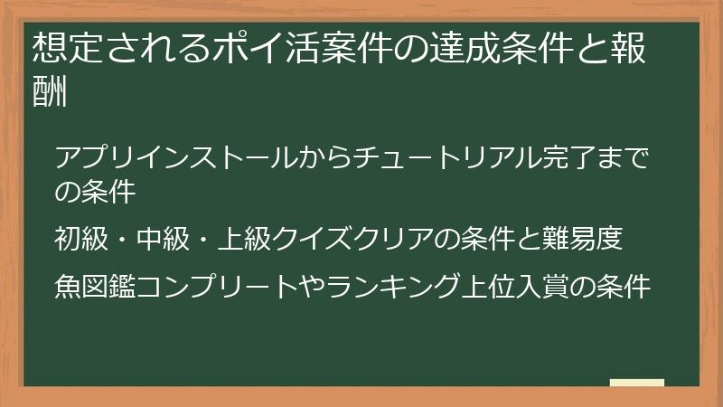 実際に「ドンとクイズ」のポイ活案件に参加したユーザーの投稿を探し、達成条件、報酬額、攻略方法などの情報を収集します。 - 「ドンとクイズ」に関する投稿が見つからない場合でも、類似の魚知識クイズアプリのポイ活案件に関する投稿を参考に、案件の傾向や注意点などを把握することができます。