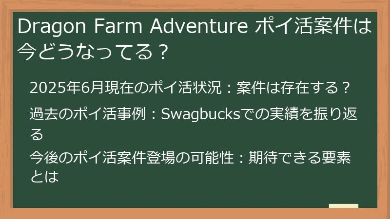 ここでは、「Dragon Farm Adventure」と「Dragon Farm: Island Adventure」のポイ活案件が現在どうなっているのか、過去の事例、そして今後の可能性について詳しく解説します。
