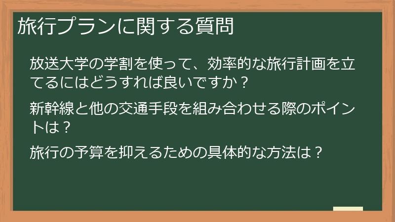 このセクションでは、放送大学の学割を活用した新幹線旅行で費用を節約するための方法に関するよくある質問にお答えします。