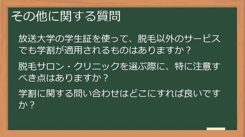 脱毛以外のサービスへの学割適用、脱毛サロン・クリニック選びの注意点、そして学割に関する問い合わせ先など、放送大学生活における学割の活用に関する幅広い疑問にお答えします。