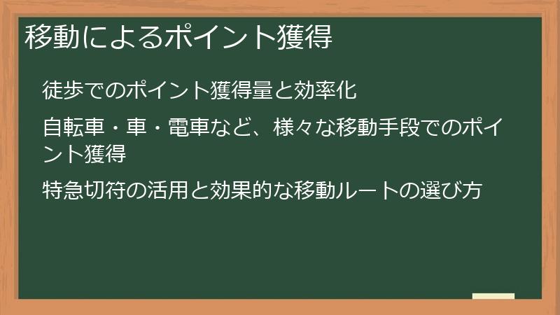 本セクションでは、移動手段ごとのポイント獲得量や効率、そして移動距離を最大化するためのテクニックについて詳しく解説します。