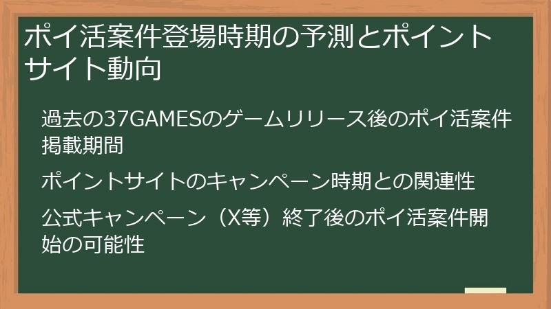 37GAMESが過去にリリースしたゲームや、同じ経営シミュレーション・放置RPGジャンルのゲームのポイ活案件を参考に、達成条件、報酬額、掲載ポイントサイトなどを予測することで、読者が案件登場時にスムーズにポイ活を始められるようにサポートします。