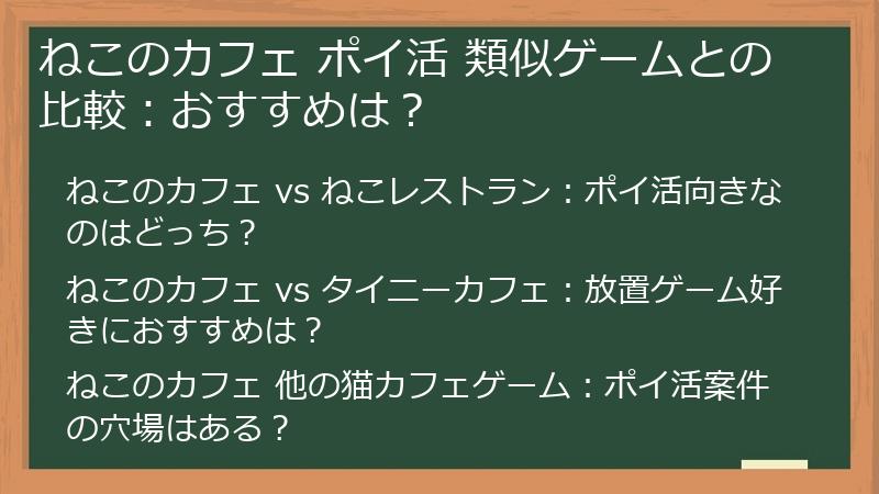 これらの情報を参考に、あなたもポイ活案件の穴場を見つけ、「ねこのカフェ」以外の猫カフェゲームでもポイ活を楽しんでみてください。