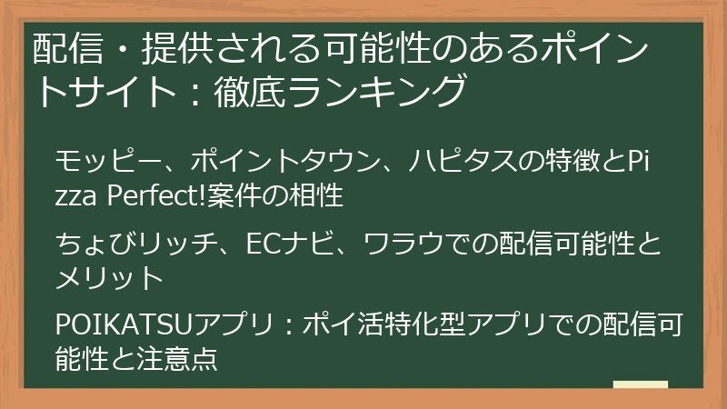 これらのポイントサイトは、モッピー、ポイントタウン、ハピタスに比べると、配信可能性はやや低いですが、「Pizza Perfect!」の案件が配信される可能性は十分にあります。