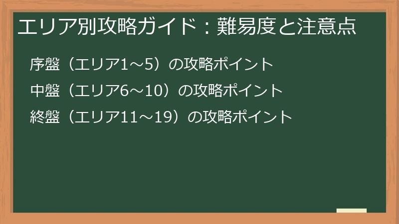- エリア16到達:エリア15とほぼ同程度の難易度ですが、ポイント数が若干異なる場合があります。