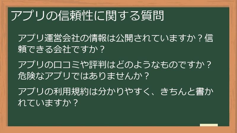 - アプリの運営会社の規模や実績、評判なども考慮しましょう。大手企業や、実績のある企業が運営するアプリは、比較的安心です。運営会社の情報を調べ、企業の規模や信頼性を確認しましょう。運営会社の情報が不透明なアプリは、利用を避けるべきです。