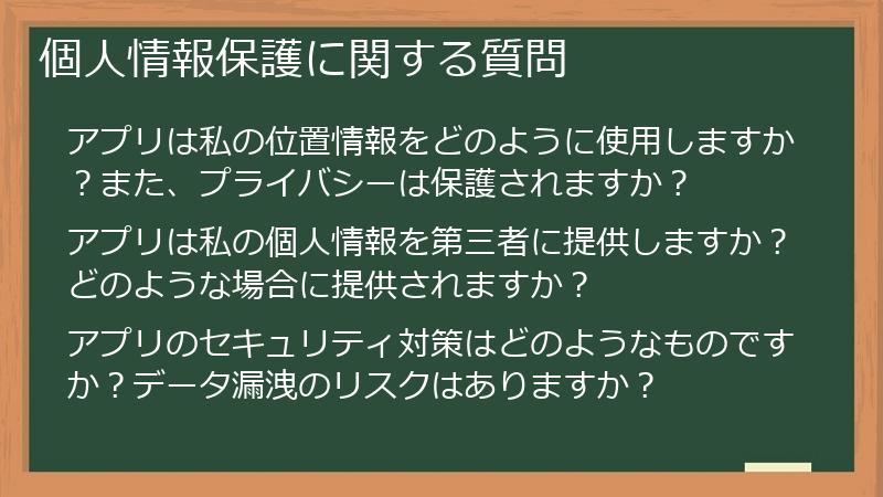 - アプリがどのような個人情報を収集し、どのように利用・管理しているのか、プライバシーポリシーで確認しましょう。位置情報データの他に、氏名、メールアドレス、年齢などの個人情報を収集しているアプリもあります。個人情報の利用目的が明確に示されているかを確認し、不明な点があれば運営元に問い合わせることをお勧めします。個人情報の第三者提供についても、プライバシーポリシーで確認しましょう。同意なく個人情報を第三者に提供するアプリは利用を避けるべきです。