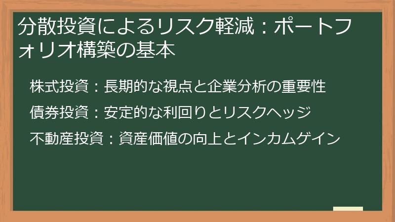 - ポートフォリオの構築:複数の投資対象に資金を分散することで、リスクを軽減する分散投資を行います。 株式、債券、不動産、投資信託などを組み合わせて、バランスの良いポートフォリオを構築しましょう。