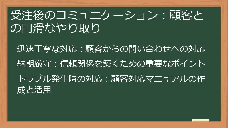 - 迅速な対応、丁寧なコミュニケーション、アフターフォローなどを徹底することで、顧客満足度を高め、リピーターを獲得できます。顧客との良好な関係を築くことは、長期的な成功に繋がる重要な要素です。