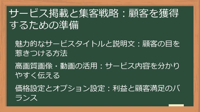 次に、料金設定についてです。料金設定は、サービスの内容、市場価格、自身のスキルなどを考慮して決定する必要があります。
