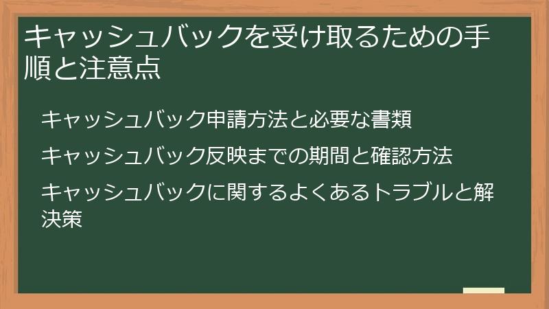 このセクションでは、キャッシュバックの申請方法、必要な書類、反映までの期間、そしてキャッシュバックに関するよくあるトラブルとその解決策を解説します。