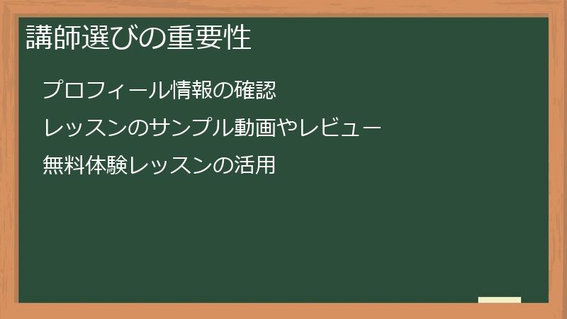 無料機能を活用して、自分に合った講師を見つけ、実際にレッスンを受けてみることをおすすめします。
