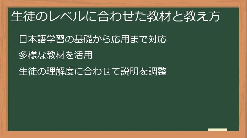 このように、生徒のバックグラウンドに合わせて、レッスン内容を調整することで、生徒のモチベーションを高め、学習効果を高めることができます。