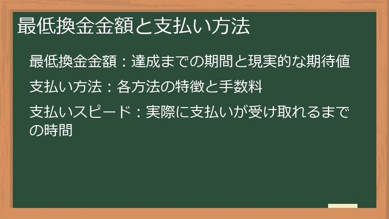 最低換金金額に到達するまでの期間や、各支払い方法の特徴、手数料、そして実際に支払いが受け取れるまでの時間など、ユーザーにとって重要な情報を網羅的に提示します。