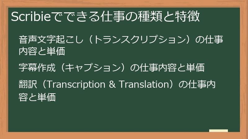 この章では、Scribieで実際に行える仕事の種類、それぞれの仕事の特徴、そして報酬の仕組みについて詳しく解説します。